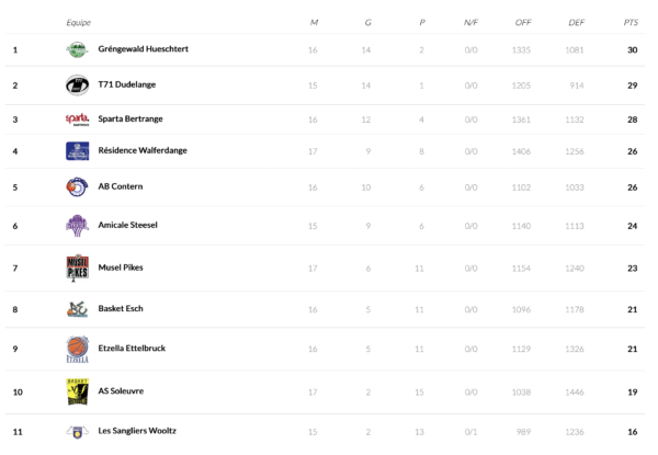 All 5 games will be played on Saturday, the top game is the one between T71 (14:1 record) and Sparta (12:4). League leader Gréngewald (14:2) hosts Zolwer (2:15) and the hosts are the favorite to earn a victory in front of their home fans. The play-off race is in the focus over the remaining game days: the Musel Pikes (6:11), Basket Esch (5:11) and Etzella (5:11) will compete for places 7 and 8. Esch has the easiest taks on paper this Saturday with a road game in Wiltz and could take advantage to grab a lead over Etzella if the team from Ettelbruck loses on the road in Walferdange. The Musel Pikes face a difficult home game against Amicale and could make a big step towards the play-offs with a home win. AB Contern does not play this weekend.