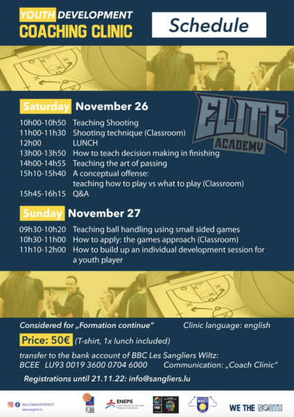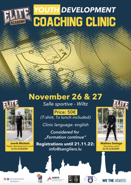 The basketball federation, in collaboration with Les Sangliers Wiltz and ENEPS, organizes a coaching clinic on November 26th and 27th in Wiltz. The main coach will be interantional player development coach Joerik Michiels.