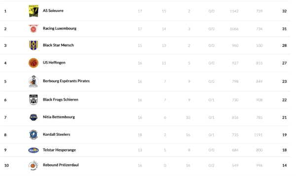 The 2 best women teams from the second league will play against Wiltz and Sparta, the two teams that finished the LBBL regular season on places 9 and 10, in a promotion/relegation group. The points between the 4 teams will be set to 0 and there will a total of 6 games for each team. The best 2 teams will play in the women’s LBBL next season.